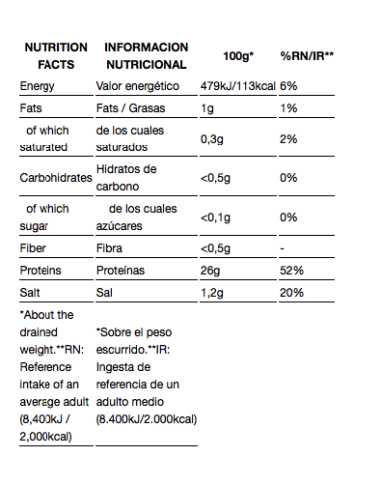 100 gr. (escurridos) de pechuga fresca de pollo, cocinada en su jugo y preparada de forma que puede comerse en cualquier momento y en cualquier lugar porque no requiere de ningún tipo de conservación.