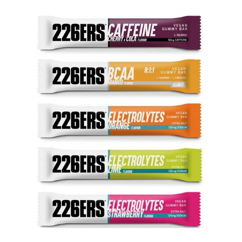 Una Gummy Bar Electrolyte contiene, 125 mg de Sodio, 27 mg de Magnesio y 9 mg de Potasio. Dos barritas de gominola contienen la misma cantidad de sales minerales que una cápsula Sub9 Salt Electrolyte.