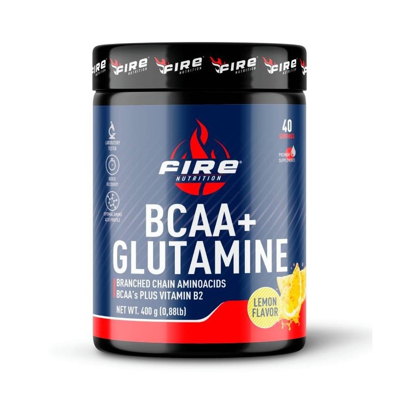 BCAA + GLUTAMINE LIMON 400G (Fire Nutrition). Complemento alimenticion a base de BCAA´s + Glutmaina con un plus de vitamina B12. No te pierdas todos sus beneficios: Fortalecimiento del sistema inmunológico, protección, recuperación y ganancia muscular.