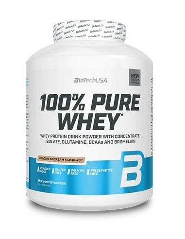 100% Pure Whey 2.3KG (BioTechUSA). Complejo de suero de leche con bromelina, aminoácidos, sin azúcar añadido, sin aceite de palma, con edulcorante.