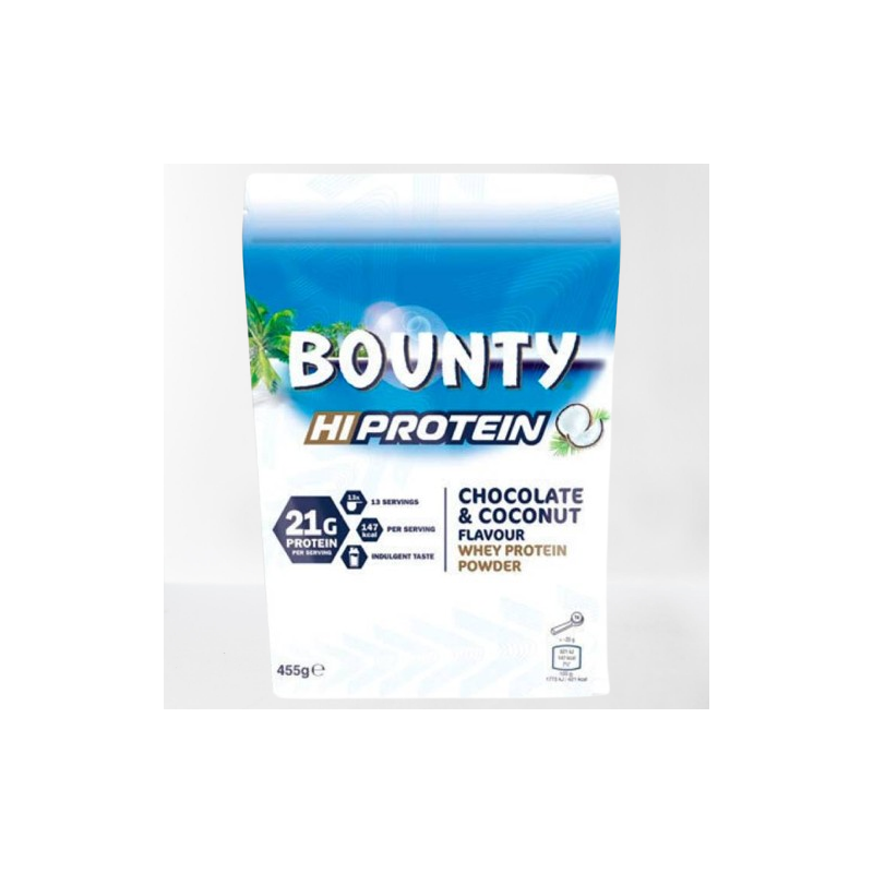 Bounty Hi Protein 455G (Mars Protein). Disfruta del exquisito sabor de de coco y chocolate de la nueva proteína de suero de Bounty. 21gr de proteína y 140 calorías por porción.