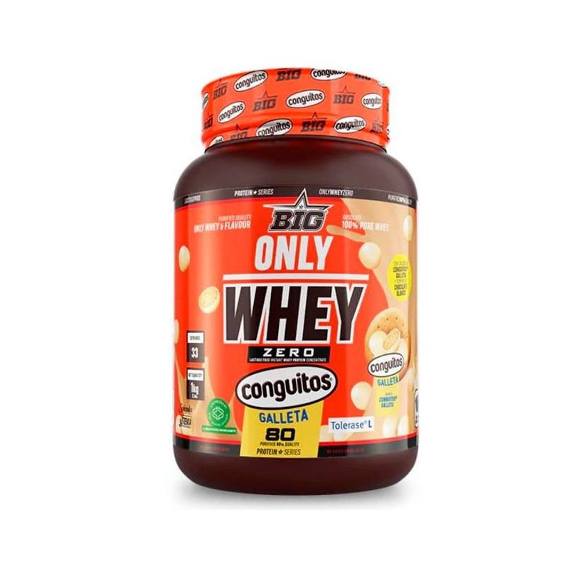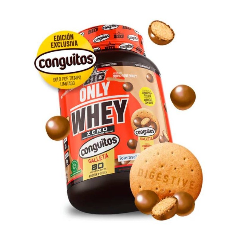 ONLY WHEY ZERO sabor CONGUITOS® GALLETA, la nueva proteína de concentrado de suero sin lactosa de BIG®, elaborada con Lacprodan® SP-8011V Instant, la proteína elegida por las mejores marcas internacionales de suplementación deportiva y uno de los mejores concentrados de suero del mercado, y con la novedosa patente Tolerase L-Lactasa®, una formulación con enzimas de lactasa que mejora significativamente la digestión de la lactosa contenida en el suero. Sin duda, un valor añadido que marca una diferencia para la mayoría de consumidores que busca una proteína en polvo de la más alta calidad.