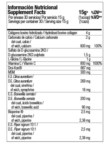 300mg de Metilsulfonilmetano (MSM) responsable de la formación de colágeno, contribuyendo a aliviar y prevenir dolores, inflamaciones además de ayudar con la regeneración muscular y eliminación del ácido láctico (agujetas).